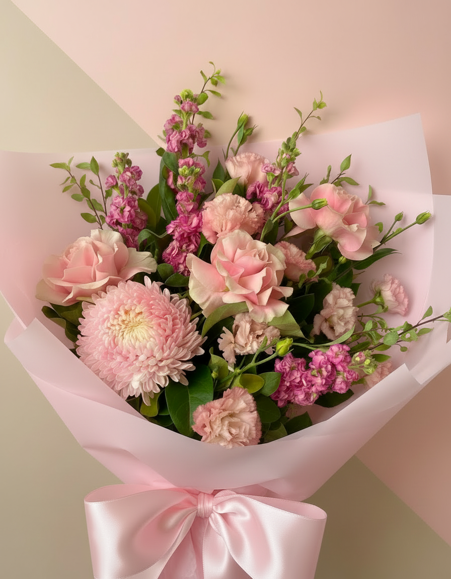 Blush Devotion features soft pink tones layered with delicate texture and fresh greenery. Thoughtfully composed using classic blooms, this arrangement feels refined, balanced and quietly beautiful.