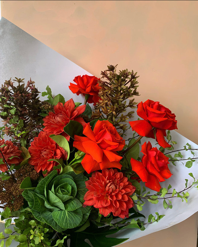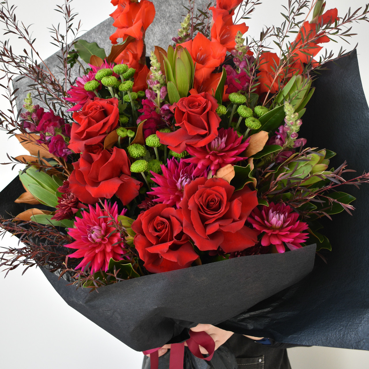 Wrapped in Radiance is a vibrant bouquet of rich red roses paired with bright seasonal blooms and fresh foliage. Layers of burgundy and plum colours and soft texture come together to create a design that feels luminous, full and beautifully expressive.