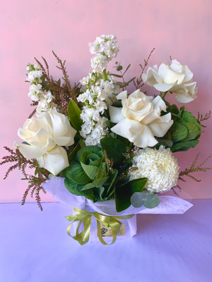 A fresh box Arrangemnet inlcuding seasonal white and green blooms